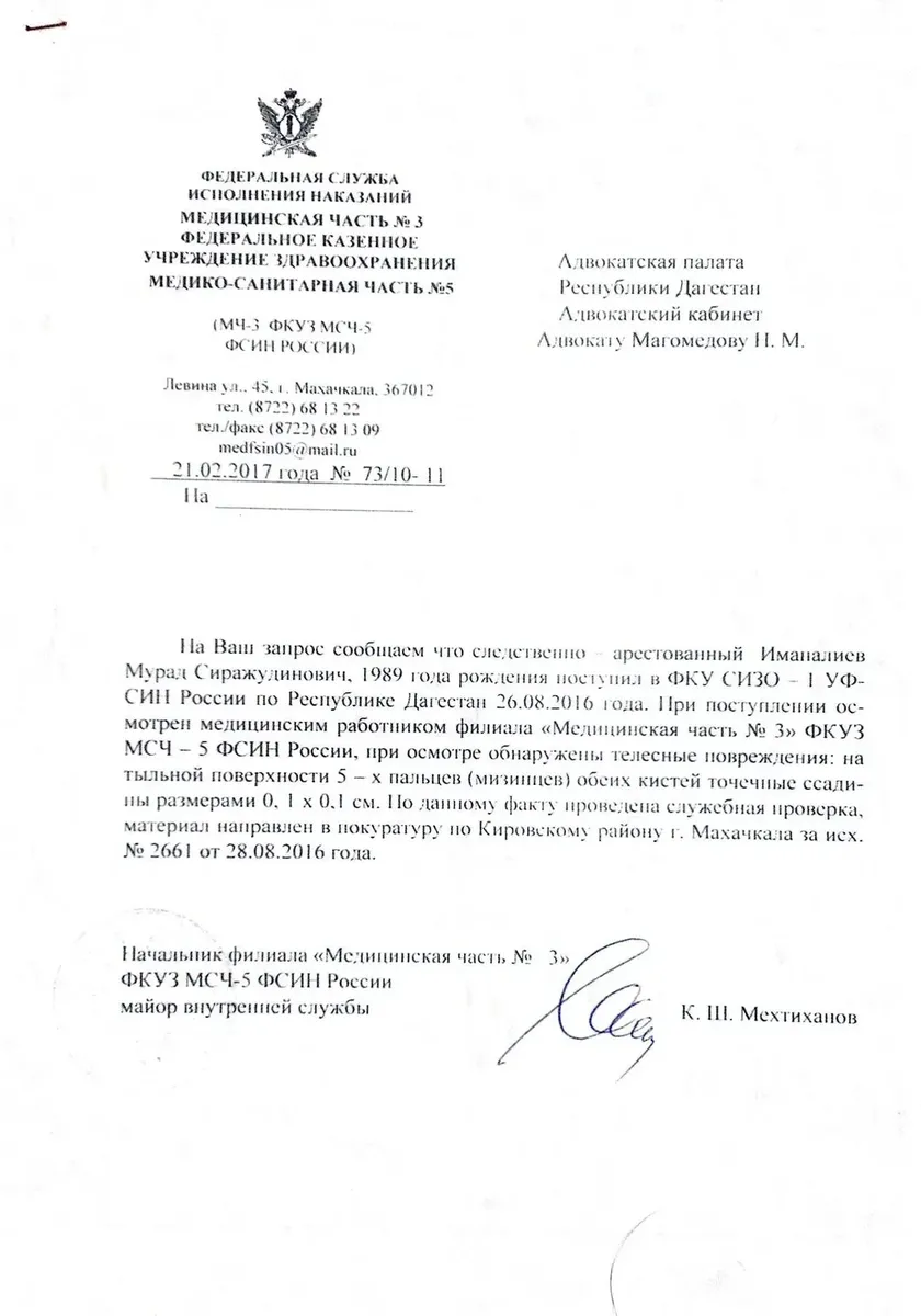 И вот на основании всего этого Кировский районный суд Махачкалы приговаривает Марата Иманалиева к восьми годам строгого режима, а его брата Мурада к восьми с половиной годам строгого режима. Марат сейчас отбывает срок в колонии Иркутска, а Мурад — в Оренбурге.