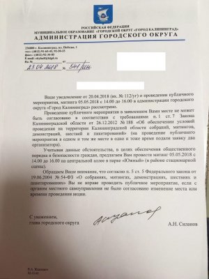 В ответе чиновники сообщили, что эти места заняты под другие мероприятия, и предложили сторонникам Навального провести акцию на пересечении улицы Доватора и Гарнизонного переулка. Активисты приняли предложение властей.