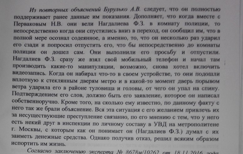 «Сейчас посыпались угрозы со стороны оперов. Как вы меня назвали? Черт? Вы же мне хотели горб сломать», — говорит спортсмен на записи. Бурулько отворачивается, смеется и ударом выбивает телефон из рук Нагдалиева. «После того, как он меня ударил по руке, у меня посыпались сомнения, что это не полицейский, а просто гражданское лицо», — вспоминает тренер. Он поднял телефон, толкнул Бурулько и снова пошел в метро, но, услышав крики «Стоять!», подчинился и со словами «Сопротивления не оказываю» поднял руки.