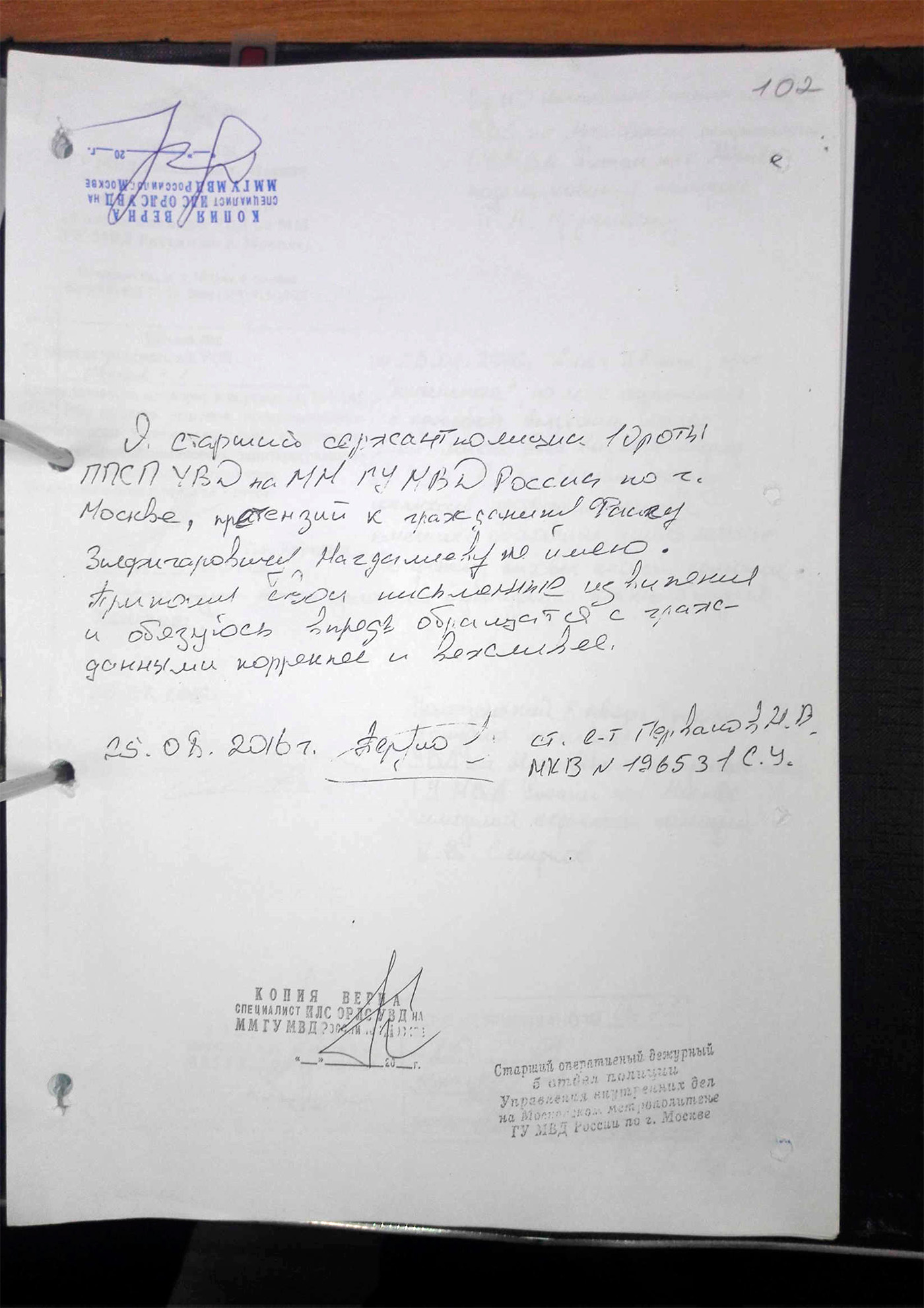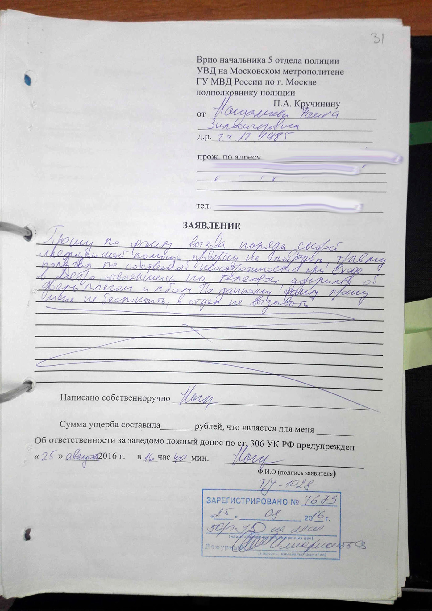 Фаиг не растерялся и назначил встречу у здания УВД по Северо-Западному административному округу Москвы, но к нему так никто и не пришел, а тренер отправился писать очередное заявление — на этот раз об угрозах. На проходной УВД к нему подошел майор и попросил паспорт, но получил отказ — по словам Нагдалиева, он думал, что оставил документ в кармане другой куртки, хотя позже выяснилось, что на самом деле паспорт был у него с собой. Тогда полицейский ушел в дежурную часть, отделенную от холла стеклянной перегородкой; тренер попросил пропустить внутрь и его, но майор сказал, что он не уполномочен принимать такие решения.