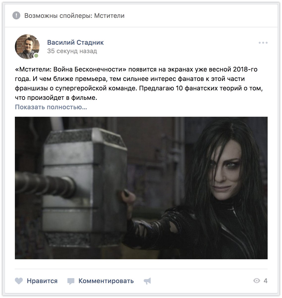 Над записями с возможным раскрытием сюжета фильма теперь выводится специальное сообщение о том, что в них могут содержаться спойлеры. А текст таких постов сворачивается до фразы «Показать полностью…».