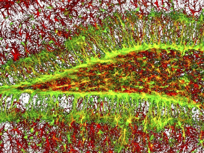 Нейрогенная ниша гиппокампа. Зелёным изображены стволовые клетки (Nestin-GFP), красным – астроцитарный белок (GFAP). Трёхмерная реконструкция серии конфокальных изображений. Предоставлено авторами исследования Ученые из Московского физико-технического университета, Университета Стони-Брук и лаборатории в Колд Спринг Харбор пронаблюдали, как делятся и расходуются нейральные стволовые клетки в гиппокампе у мышей – области мозга, критически важной для обучения и памяти. Оптимистичные прогнозы о наличии симметричного деления – когда из одной стволовой клетки получается две – не подтвердились. Если такое деление и происходит, то не более чем в десяти процентах случаев. Это значит, что восполнение стволовых клеток, которые могли бы дать начало новым нейронам – редкий или вовсе не происходящий процесс. Кроме этого ученые определили пространственные особенности исчезновения стволовых клеток в стареющем мозге. Статья с полученными результатами опубликована в Scientific Reports, кратко о работе рассказывает пресс-релиз МФТИ.