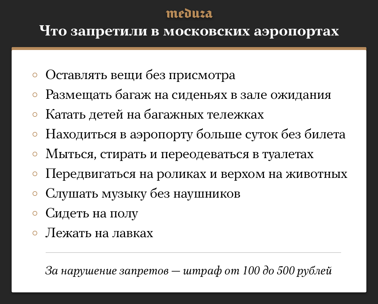 Московская областная дума приняла закон, по которому полиция получила возможность штрафовать посетителей аэропортов за нарушение правил поведения. К таким нарушениям, в частности, отнесены переодевание в туалетах, катание детей на багажных тележках, размещение багажа на сиденьях залов ожидания. Эти запреты коснутся аэропортов Шереметьево, Домодедово и Жуковский (Внуково под юрисдикцию подмосковных законодателей не подпадает). Спецкор «Медузы» Саша Сулим поговорила с главой комитета Мособлдумы по транспорту, связи и информатизации Олегом Григорьевым о сути запретов.