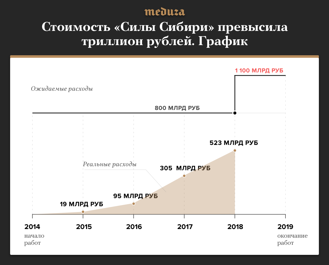 27 апреля глава управления департамента строительства «Газпрома» Андрей Воробьев объявил, что в текущих ценах стоимость газопровода «Сила Сибири» составляет 1,1 триллиона рублей. «Газпром» впервые изменил оценку стоимости газопровода — ранее данные всегда приводились в ценах 2011 года. Согласно ежегодным отчетам «Газпрома», на «Силу Сибири» уже выделили больше полутриллиона рублей. «Сила Сибири» строится с 2014 года для транспортировки газа в Китай. К 2018 году было готово 75% газопровода, который должны запустить в конце 2019 года.