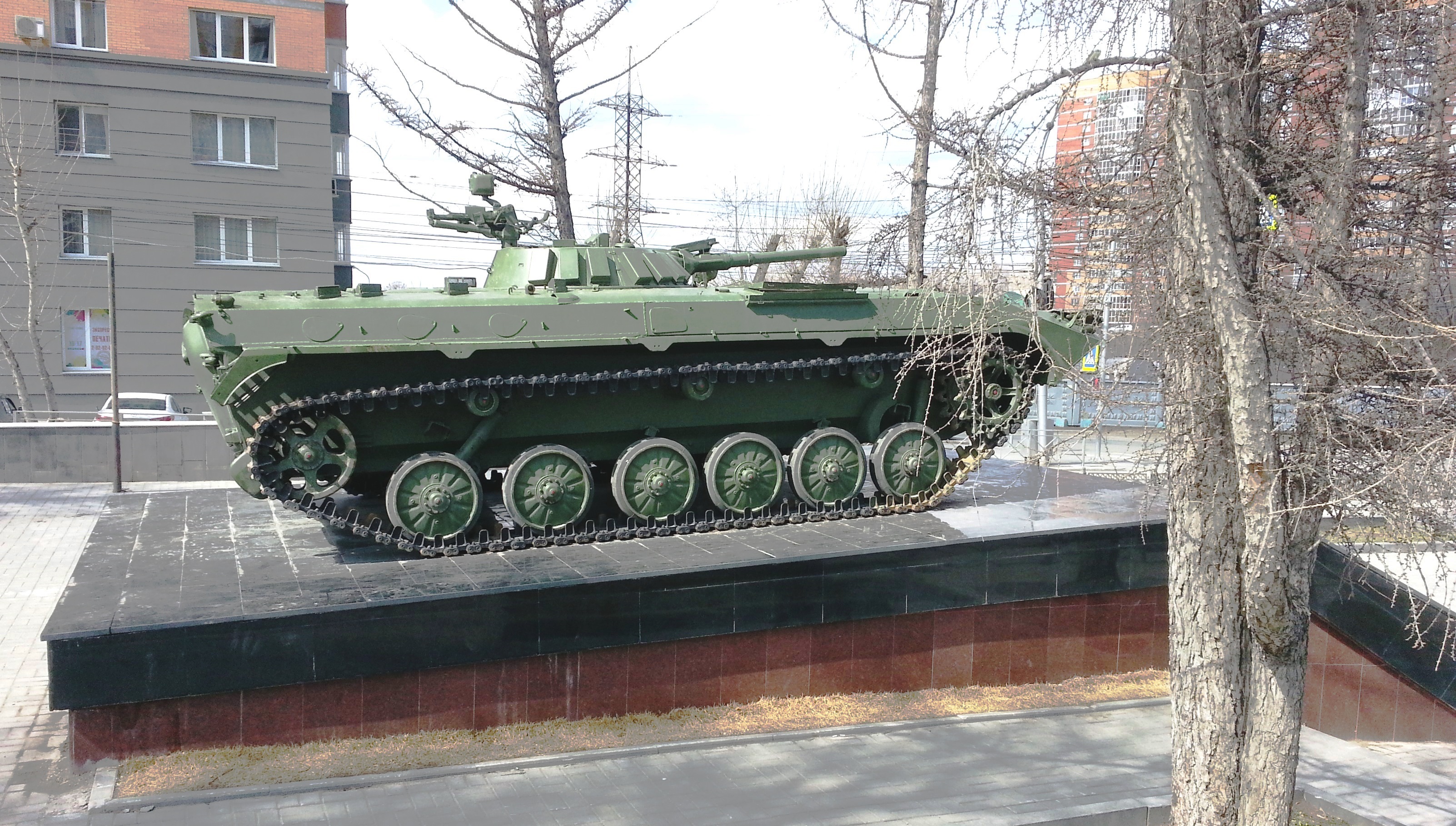 Я в архитектуре разбираюсь, и очень положительно отношусь к этому факту, потому что эта БМП стояла задом наперед. Судя по конструкции постамента, она должна стоять именно так, как сейчас ее перевернули. Дело в том, что памятник установлен в месте, где начинается аллея. Теперь он повернут пушкой вперед. Теперь люди в проезжающих мимо машинах видят памятник спереди.