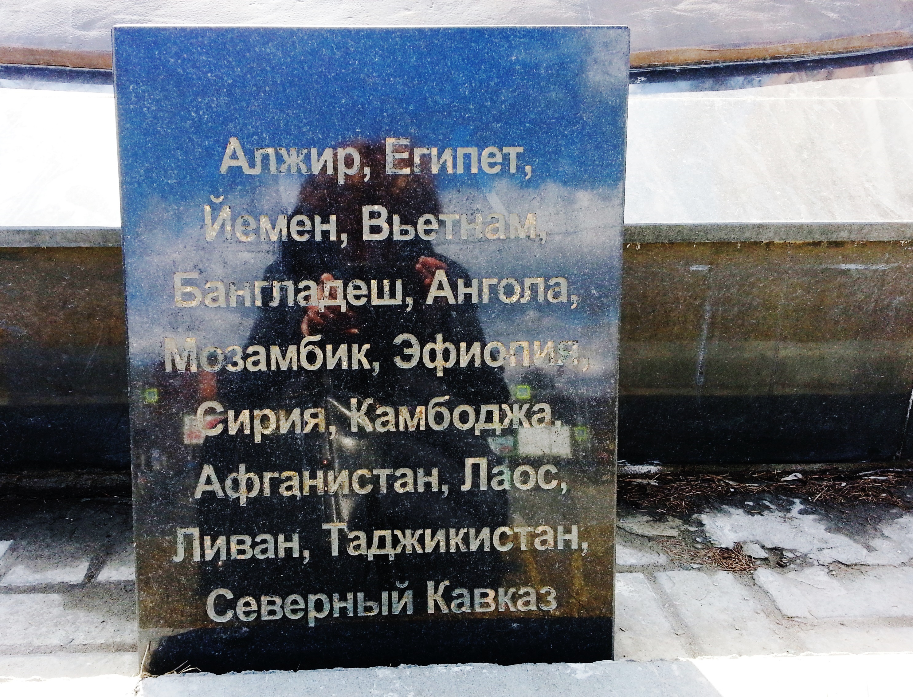 – Строго говоря, памятник не завершен. Сами инициаторы его установки, члены этого афганского общества, говорят о том, что когда они соберут еще денег, то будут отлиты фигуры военнослужащих, которые идут рядом и сидят сверху. Но ведь теперь получится, что они не возвращаются с войны, а снова идут в бой! Куда – услужливо подсказывает камень у постамента. На нем начертано: Алжир, Египет, Йемен, Бангладеш, Ангола, Мозамбик, Эфиопия, Сирия, Камбоджа, Афганистан, Лаос, Ливан, Таджикистан и Северный Кавказ. Обратите внимание, Сирия там уже есть, приписывать не надо.