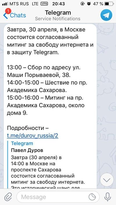 Уведомление содержит ссылку на запись основателя Telegram Павла Дурова — первую в его русскоязычном телеграм-канале, который был создан 29 апреля. Дуров называет митинг 30 апреля «историческим шансом для москвичей выразить общую позицию».