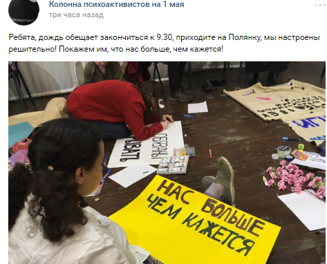 На странице «Колонна психоактивистов на 1 мая» во «ВКонтакте» сообщается, что «в широком смысле психоактивизм трактуется как действия, направленные на изучение, исследование темы психических и ментальных расстройств, границ нормы, российских психиатрических институций».