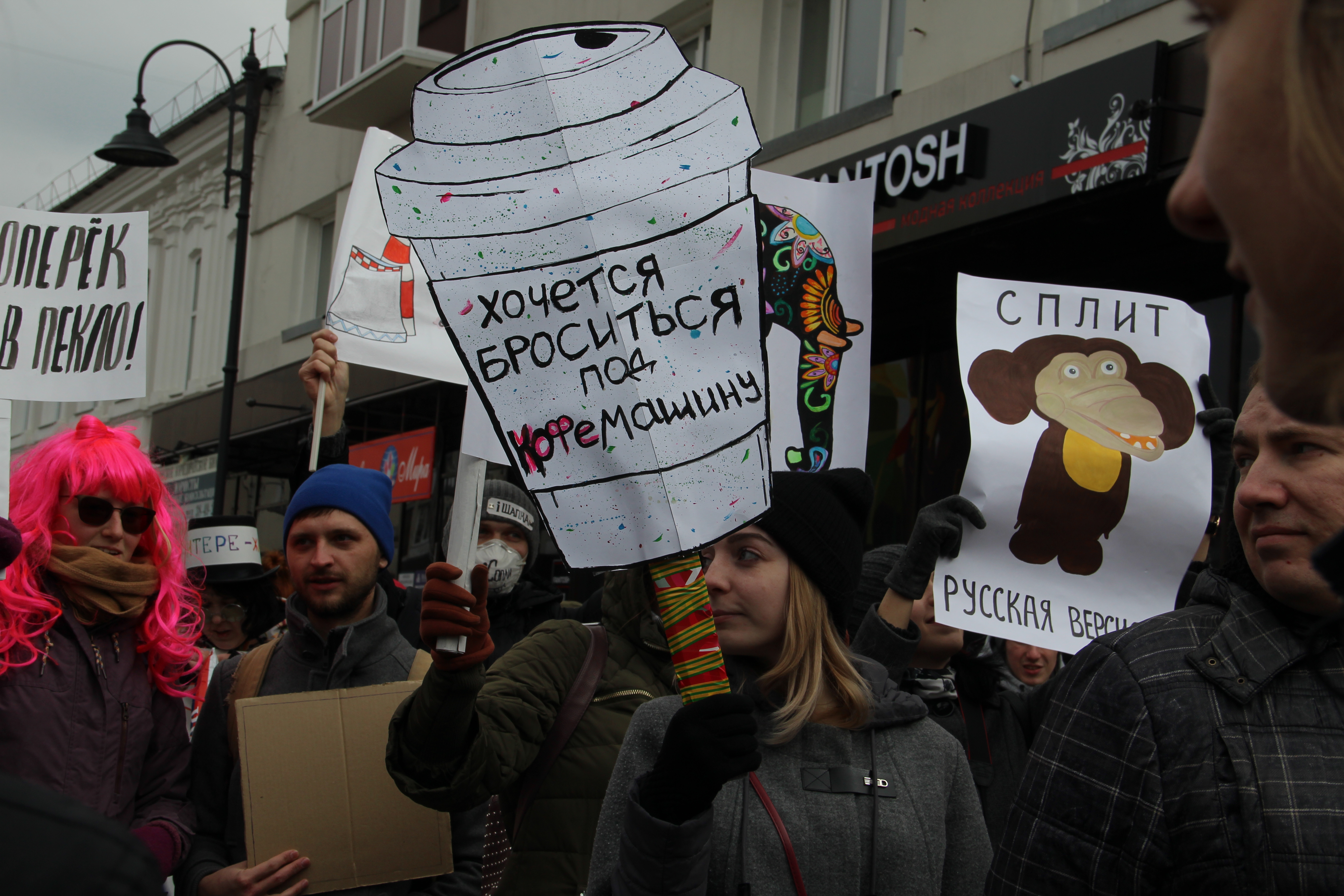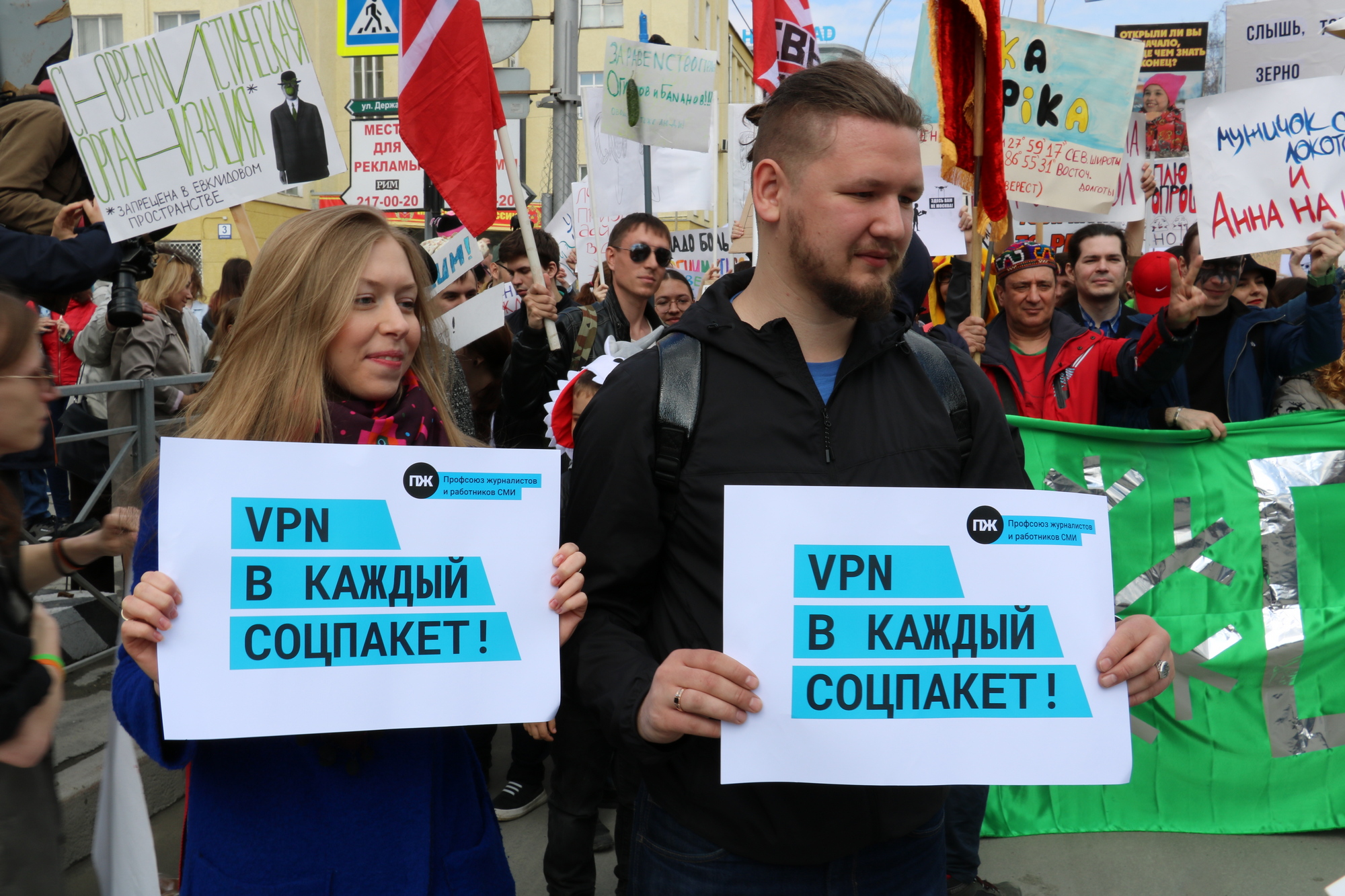 0:00 0:01:36“Севернее Кореи” – так звучит главный лозунг Монстрации в этом году. Надпись была выполнена на зеленом баннере, который несли во главе колонны. Многие участники шествия держали в руках плакаты, отсылающие к последним событиям в стране, например “У России два врага, Telegram и курага” или “VPN в каждый соцпакет”.