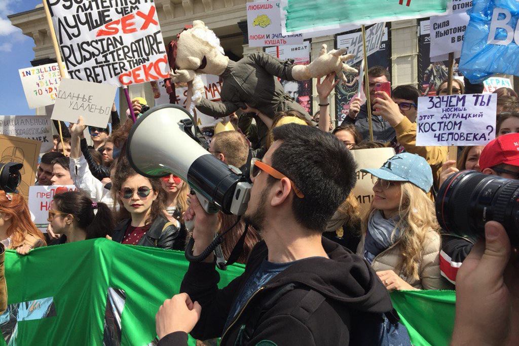 *13:18* Артем Лоскутов кричит в мегафон: «Сиськи — сиськи», «Панки хой», «Раздевайся», «Идем кушать». У той части редакции, которая осталась на работе перед мониторами, появилось чувство, что мы что-то пропускаем, и желание срочно бежать на Красный проспект.