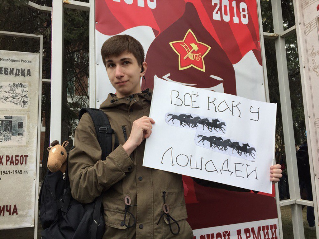 **11:52.**** Монстрации все возрасты покорны. Серьезный молодой человек по имени Николай, сделал свой первый плакат для шествия.