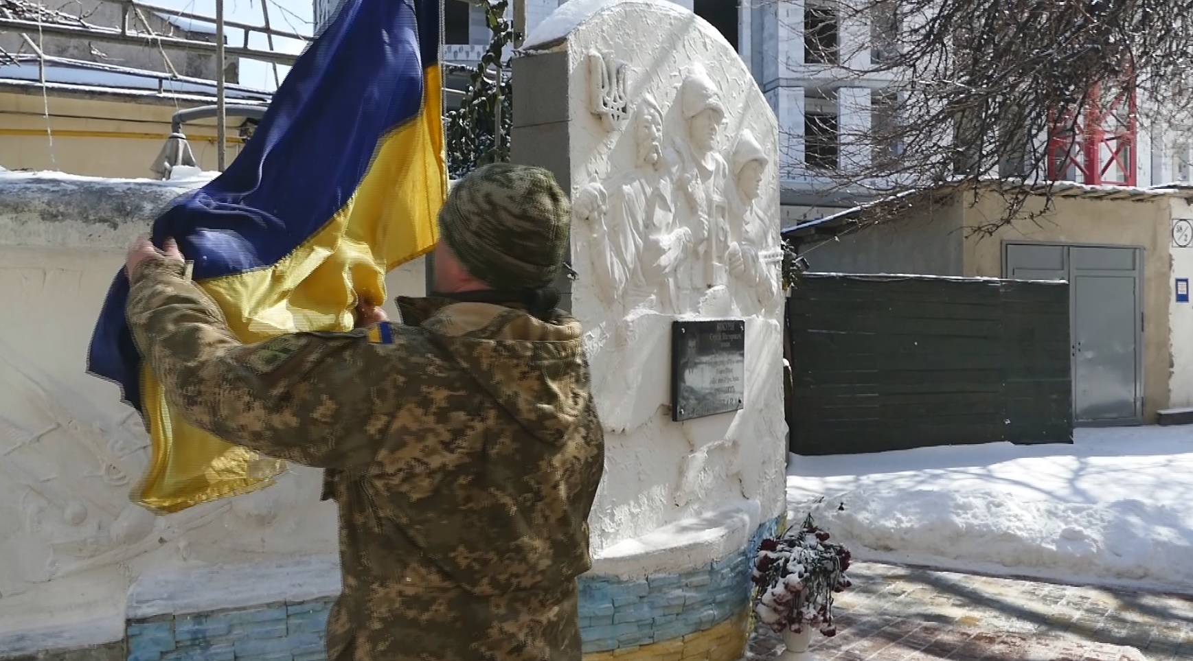 Поднятие флага Украины у картографического центра в Одессе. Справа на стене установлена мемориальная доска памяти Сергея Кокурина.