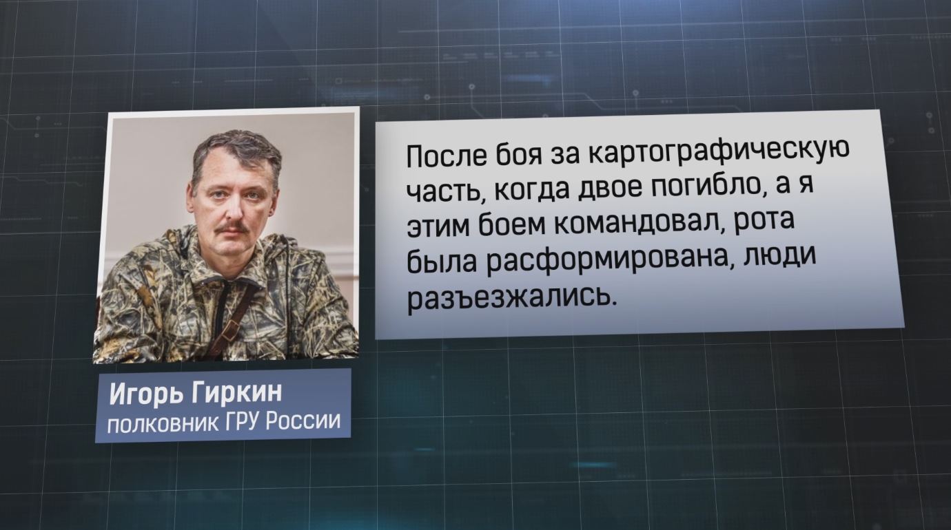«После боя за картографическую часть, когда двое погибло, а я этим боем командовал, рота была расформирована, люди разъезжались», – произнес Гиркин.
