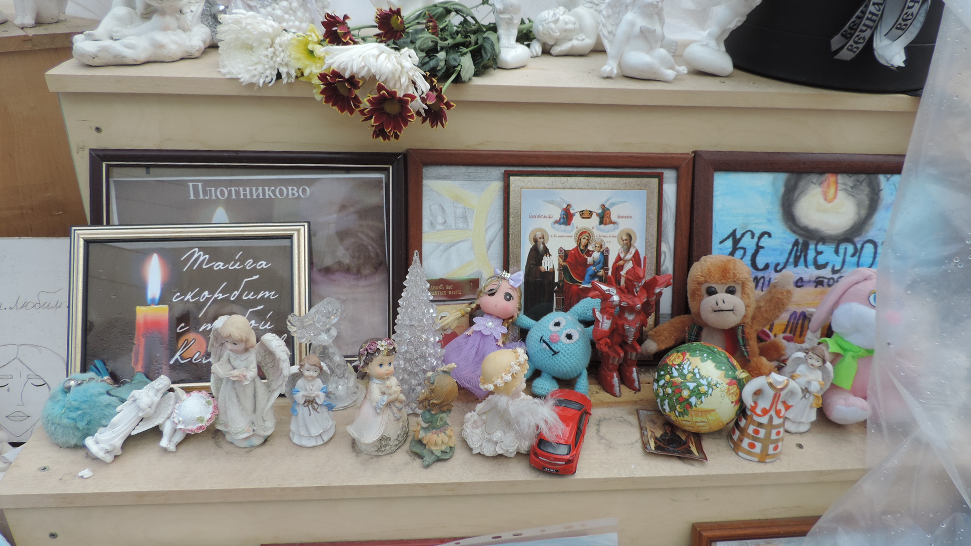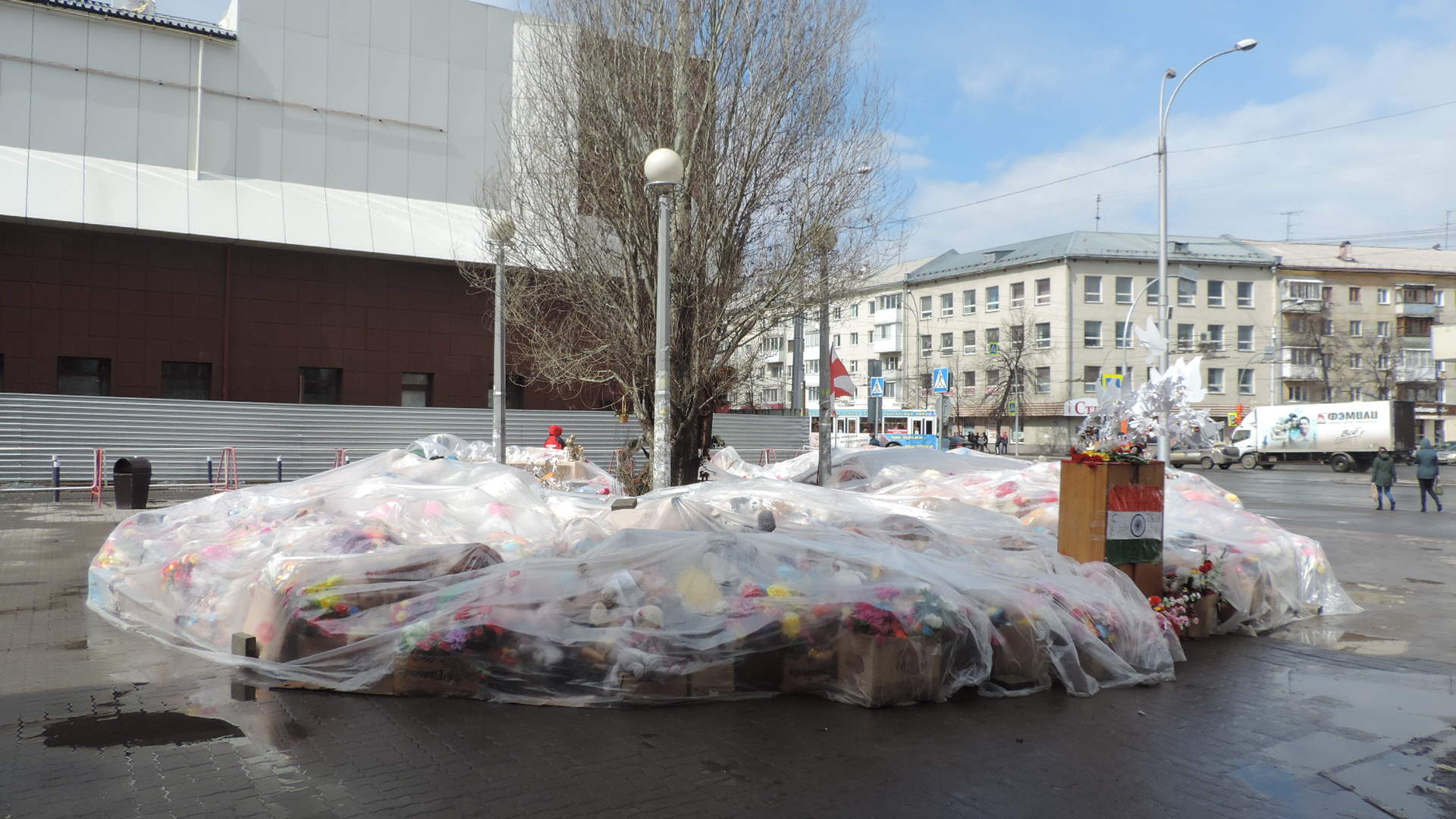Горы цветов и мягких игрушек аккуратно прикрыты полиэтиленом. У мемориала погибшим в "Зимней вишне" в Кемерове по-прежнему дежурят волонтеры.
