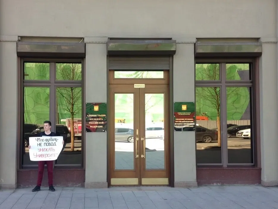 Кроме того, днем 3 мая у здания Администрации президента прошли одиночные пикеты. «ЧМ по футболу не повод унижать университет», «Фан-зона под окнами МГУ – гол в свои ворота!», «Перенос требуют наши сердца!» – такие надписи были на плакатах пикетирующих.
