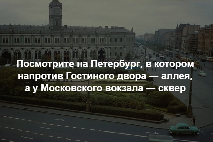 Посмотрите на Петербург, в котором напротив Гостиного двора — аллея, а у Московского вокзала — сквер