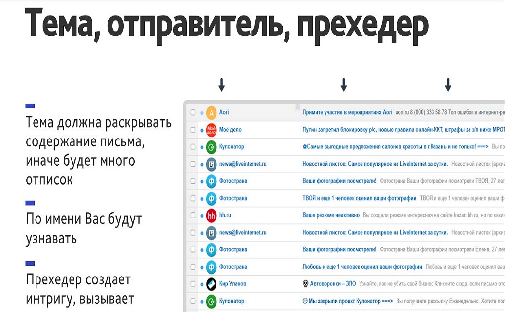 - Обязательно укажите тему письма и обратите внимание на первое предложение, которое появляется в почте (прехедер);