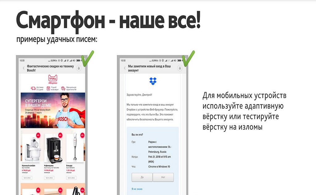 «Очень важно, чтобы у письма была не только дескоптная версия, но и мобильная. Около 47% пользователей открывают письма с мобильного, и этот показатель растет. Важно, чтобы иллюстрации, блоки текстов были подобраны под мобильную версию, чтобы ничего не съезжало». Дмитрий Фомин