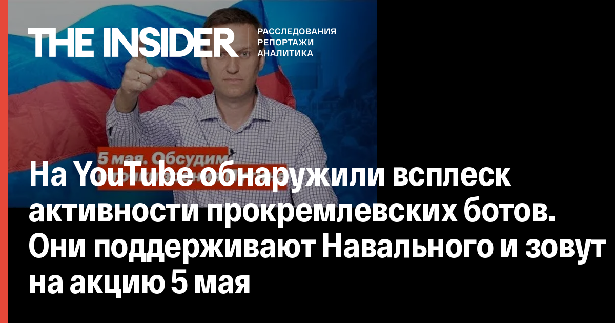 Сообщество «Наблюдатели» обратило внимание на однотипные комментарии под роликами на YouTube-каналах Алексея Навального, Ильи Варламова, Дмитрия Иванова (kamikadze_d) и Валентина Петухова (Wylsacom). Неизвестные оставили там десятки подозрительных призывов выйти на акцию Навального 5 мая.