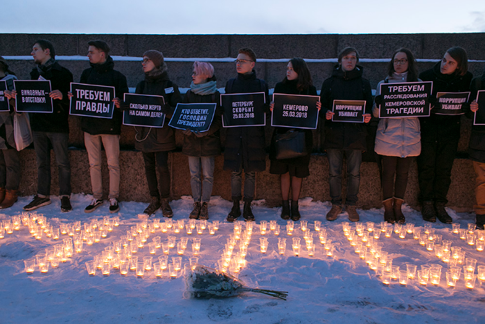 Акция памяти погибших при пожаре в торговом центре «Зимняя вишня» в Кемерове прошла в конце марта. Гантварг стоял там с плакатом «Петербург скорбит».