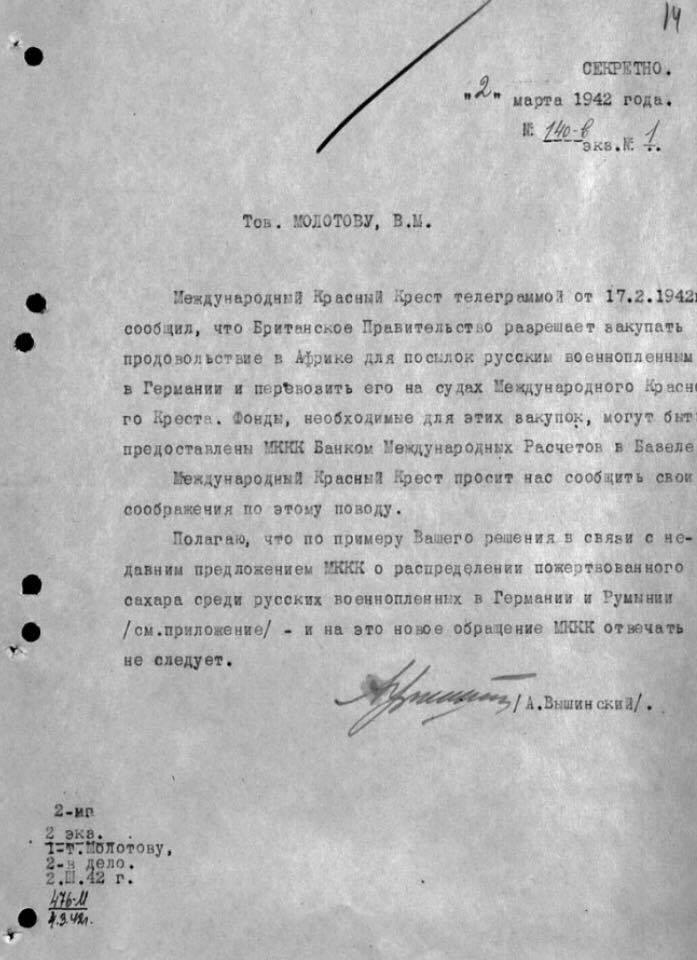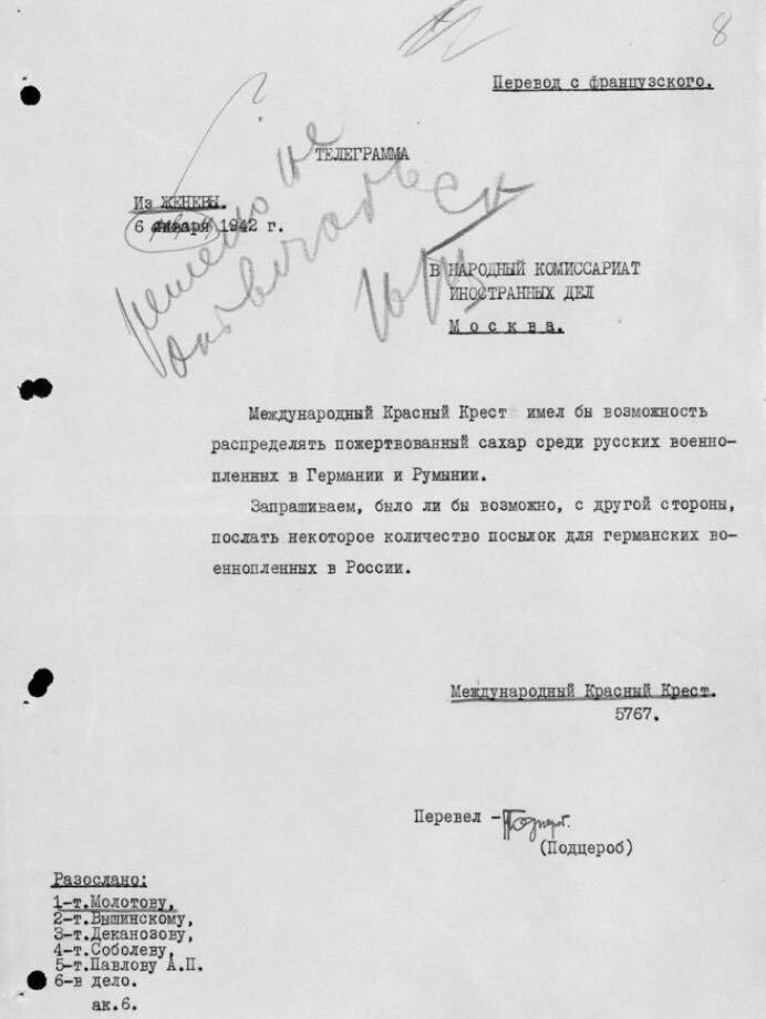– Нет, никакие материальные затраты от СССР в данном случае не требовались. Сахар предлагалось закупать на деньги швейцарских банков, а морские суда предоставляли англичане. Во время работы с архивом Красного Креста в Женеве мне в руки попал документ: письмо одного английского дипломата в Госдепартамент США по вопросам помощи советским военнопленным. Он писал, что встретился с Молотовым на приеме и спросил, в чем причина советской позиции. Молотов ответил, что считает политически нецелесообразным дать шанс Германии предстать перед общественностью способной на гуманные действия. Также нужно понимать, что практически все действия по соблюдению сторонами конвенций носили в этой войне двухсторонний характер.