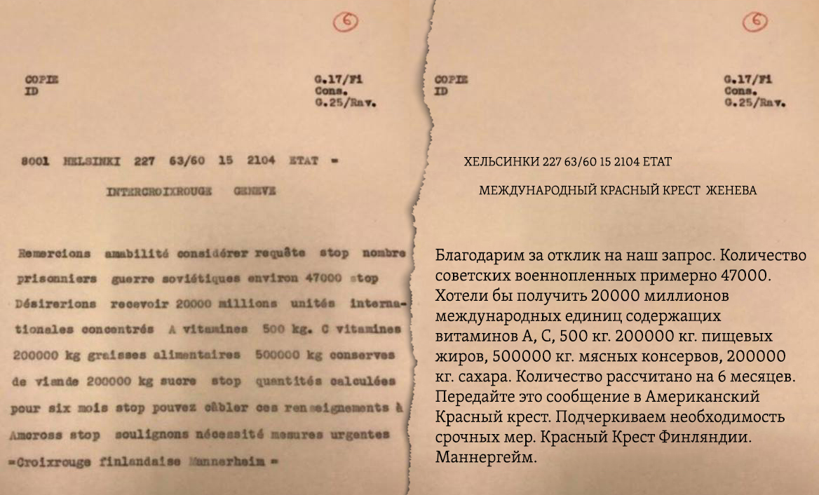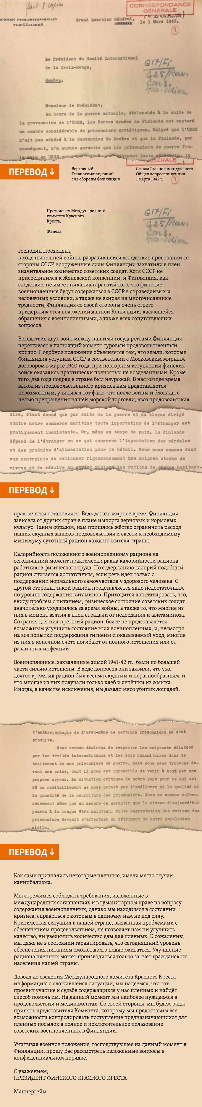– Еще два документа 1942 года на финском и французском языках – маршал Маннергейм сообщает Красному Кресту о численности советских военнопленных в Финляндии, их отчаянном положении и необходимом им питании. Что вам известно об этой истории?