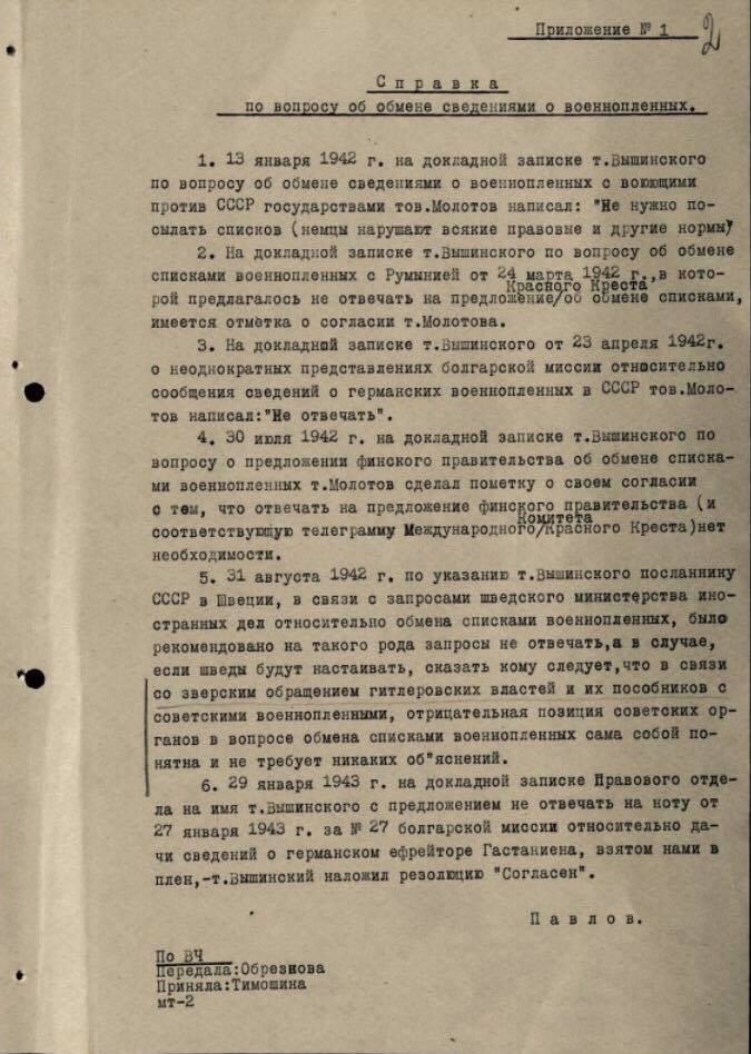 – Проблема положения советских военнопленных волновала не только Красный Крест. Добиться пересмотра позиции пытались и США, и Англия, и Турция, и Швеция. Даже Ватикан вызвался быть посредником в вопросе обмена сведениями между Германией и СССР. Об этом Молотову сообщил посол Стэндли. Однако Молотов в ответном послании указал, что этот вопрос в данный момент не интересует советское руководство.
