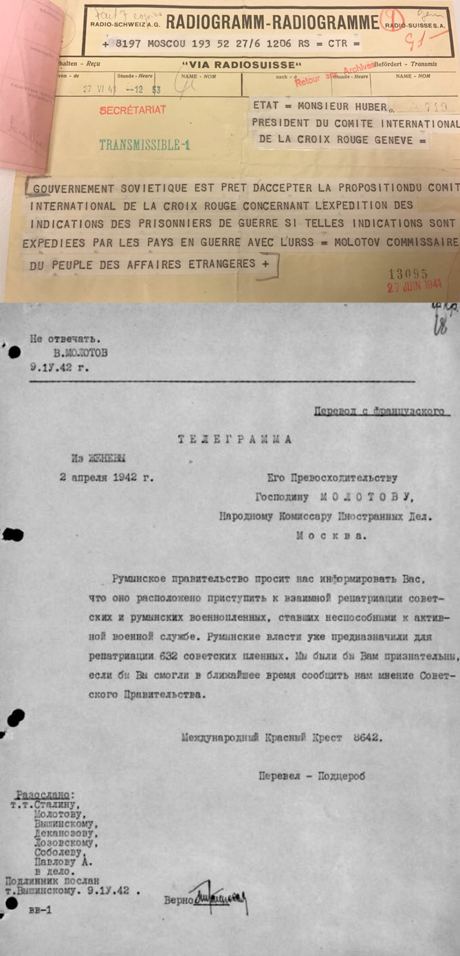 По документам из упомянутого архива видно, что отношение советского руководства к сотрудничеству с Красным Крестом с июня 1941 года по конец 1941 года сильно поменялось в худшую сторону. Этому способствовал целый ряд событий: бойцы Красной Армии массово попадали в плен, а информация, получаемая из лагерей, указывала на жестокость к пленным со стороны немцев. Однако стороны при помощи Красного Креста пытались найти какие-то точки сближения. В декабре 1941 года заместитель наркома Вышинский описал Молотову сложившуюся ситуацию: СССР получил от Германии, Венгрии, Румынии, Италии и Словакии сообщения, что те готовы пересылать списки советских военнопленных на условиях взаимности. Германия уже прислала список на 300 человек, а Румыния почти на 3000 человек. Вышинский писал, что ответный список немецких пленных подготовлен, и он считает целесообразным его отправить, иначе СССР может предстать в невыгодном свете. Однако Молотов поставил на записке визу: "...Не нужно посылать списков (немцы нарушают правовые и др. нормы)..." После этого события почти все входящие письма и телеграммы МККК в народный комиссариат иностранных дел визировались Молотовым: "Не отвечать".