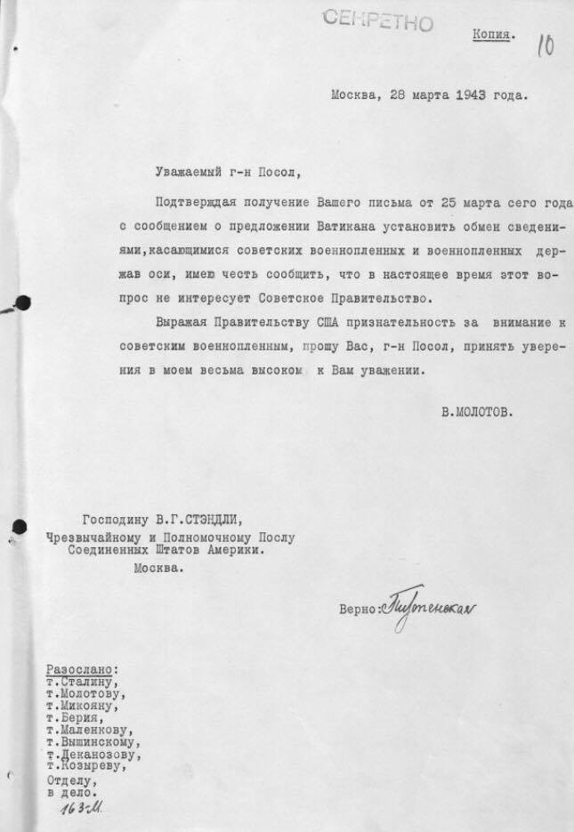 – Документ 1943 года. Молотов пишет американскому послу в Москве, что советское правительство не интересует предложение Ватикана об установлении сведений о военнопленных. Какова подоплека этой истории?