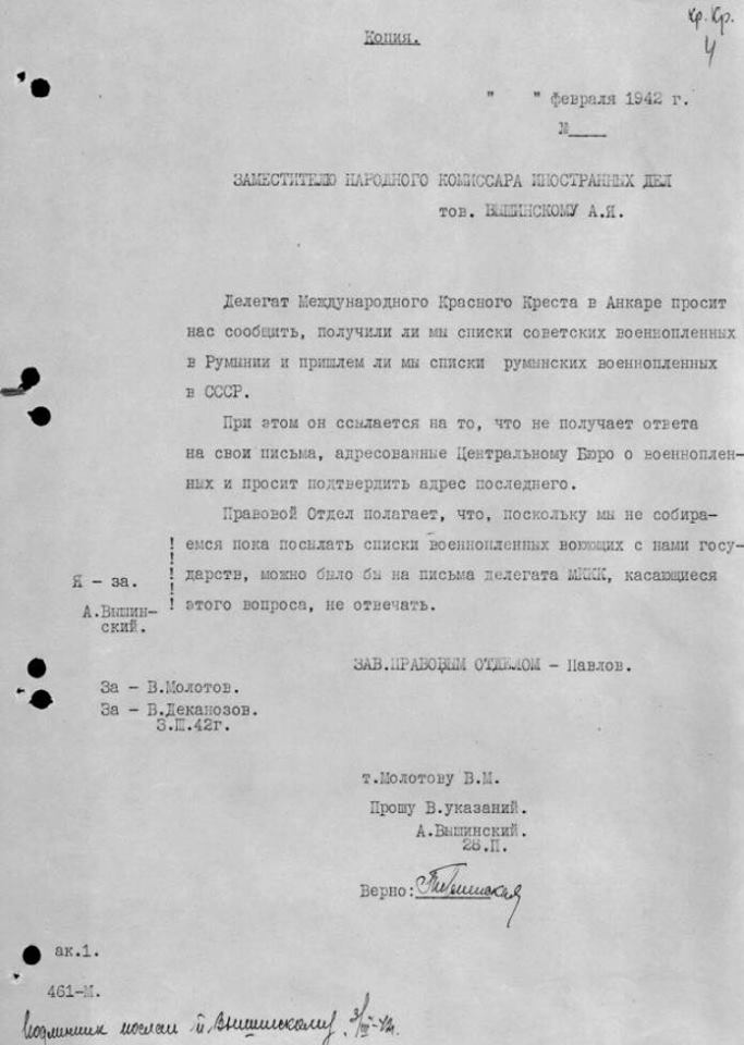– Предложения, которые делали Молотову румыны. Как ни странно, Румыния оказалась самой упорной в попытках каким-то образом помочь своим военнопленным в СССР или узнать их судьбу. В апреле 1942 года они прислали письмо, в котором сообщили, что отобрали 632 человека из числа советских военнопленных, неспособных к дальнейшей активной военной службе, и предложили их поменять на румынских военнопленных. На письме стоит виза Молотова: "Не отвечать". Но самое потрясающее письмо пришло позднее: румыны предложили отдать 1018 советских военнопленных в обмен на информацию о румынских военнопленных в СССР. То есть поменять живых людей на бумажные списки. Советское руководство это предложение также проигнорировало.