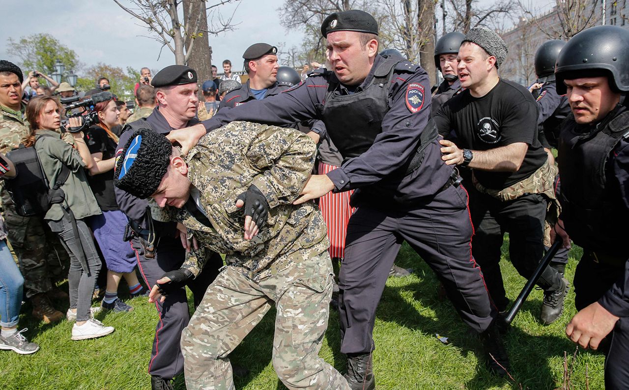 Сегодняшняя акция в Москве отличалась от предыдущих активным участием в ней людей в казачьей форме: они нападали на протестующих, оставаясь при этом практически незаметными для полиции.