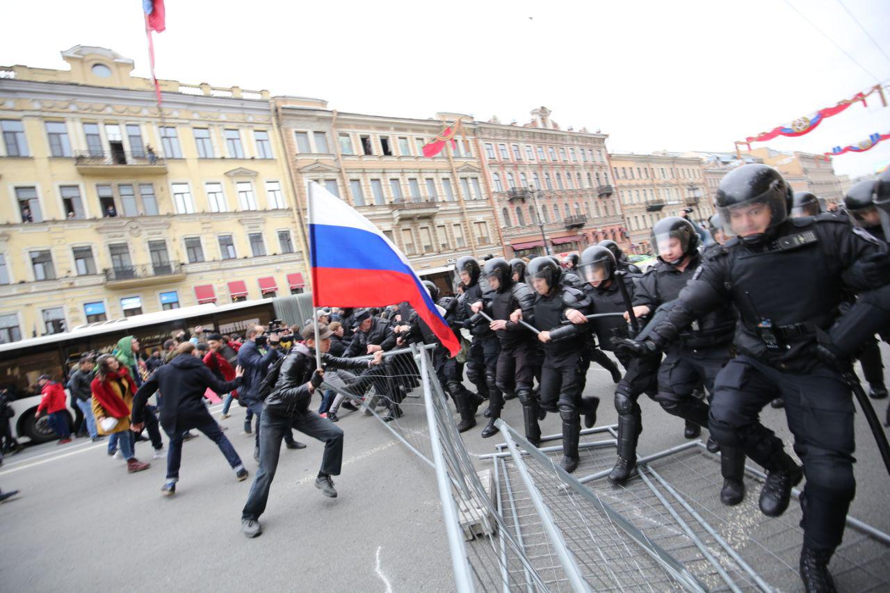 Во время акции «Он нам не царь» 5 мая в Петербурге участники вышли на перекрытый Невский проспект и двинулись в сторону площади Восстания. Там их встретил ОМОН.