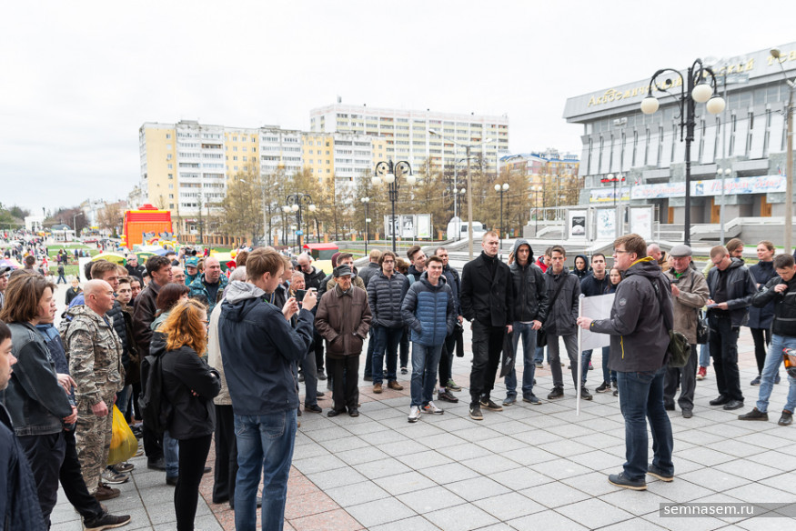На площади Никонова в Йошкар-Оле 5 мая в полдень торговали сувенирами и слушали российскую поп-музыку. Поэтому Минюст Марий Эл не позволил активистам из недавно закрывшегося штаба Навального провести там митинг и отправил их на площадку у «Мебельграда». Как и в случае с выступлением «Забастовка избирателей» 28 января, сторонники Навального предпочли митингу на окраине города одиночный пикет координатора (теперь бывшего) Вадима Кремнева в центре. Как все происходило — в репортаже «7х7».