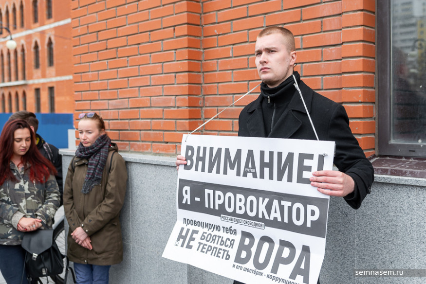 Сторонник Навального, бывший волонтер штаба Александр выступает на каждом митинге или пикете. В этот раз он пришел с большой подписью: «Провокатор». Александр рассказал историю офисной уборщицы, которая призналась ему, что зарабатывает 50 руб. за один выход, чтобы как-то прожить, имея пенсию 11 тыс. руб. В трудоспособном возрасте она работала на скорой помощи.