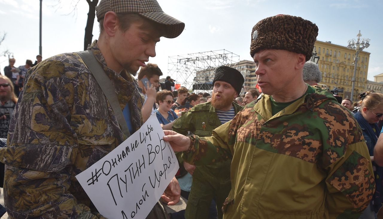 Обновление. Многие СМИ, включая «Медузу», сообщили, что на участников митинга 5 мая в Москве нападали казаки из «Центрального казачьего войска». Однако, изучив фото- и видеорепортажи с акции, «Медуза» обнаружила, что участников акции били люди в камуфляжной форме с нарукавными нашивками «Крымского казачьего полка» и «Первой сводной офицерской пластунской сотни». Подробнее о них можно прочитать в этом тексте.
