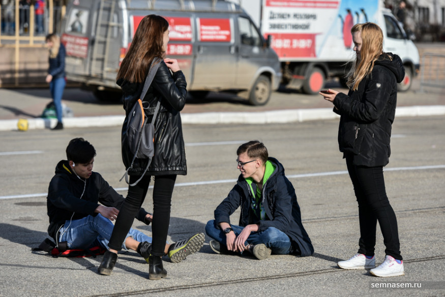 Постепенно участники акции переместились в самый центр площади. Их было около 200 человек, преимущественно молодые люди. Они общались между собой: обсуждали политическую повестку, многочисленные задержания их единомышленников в других городах России, а также разговаривали на отвлеченные темы. Происходило это под наблюдением сотрудника полиции, вооруженного видеокамерой. По периметру Стефановской площади с шумом курсировала техника — два грузовых автомобиля, предназначенных для уборки городских улиц, и «газель», наносящая дорожную разметку.