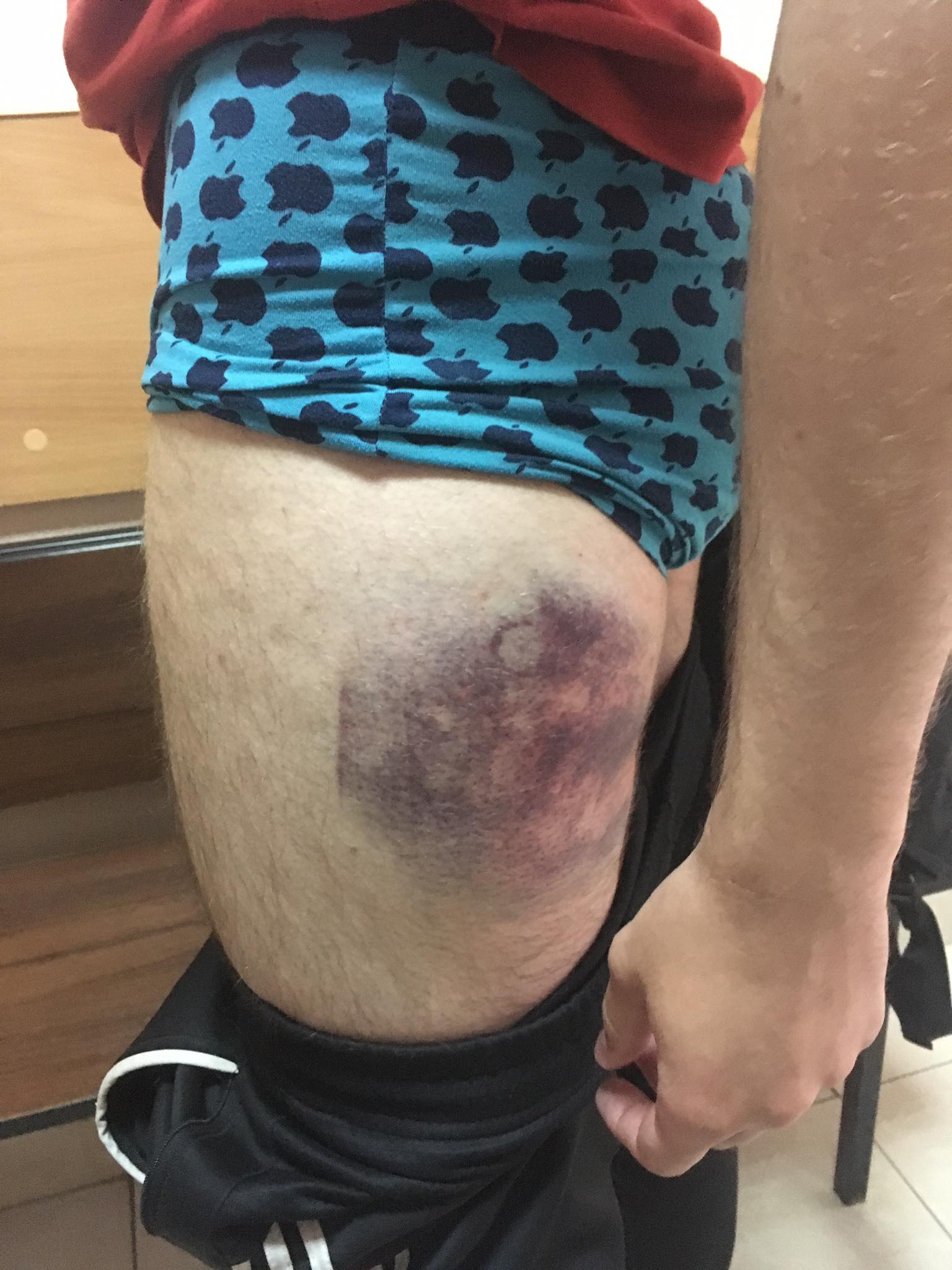 На ночь я остался в камере предварительного заключения вместе с некоторыми другими задержанными. На следующий день, когда нас повезли в суд, у меня уже были обширные гематомы на обоих ногах, и я уже чувствовалась, что нарушилась функциональность нижних конечностей: я еле ходил, еле вставал и садился.