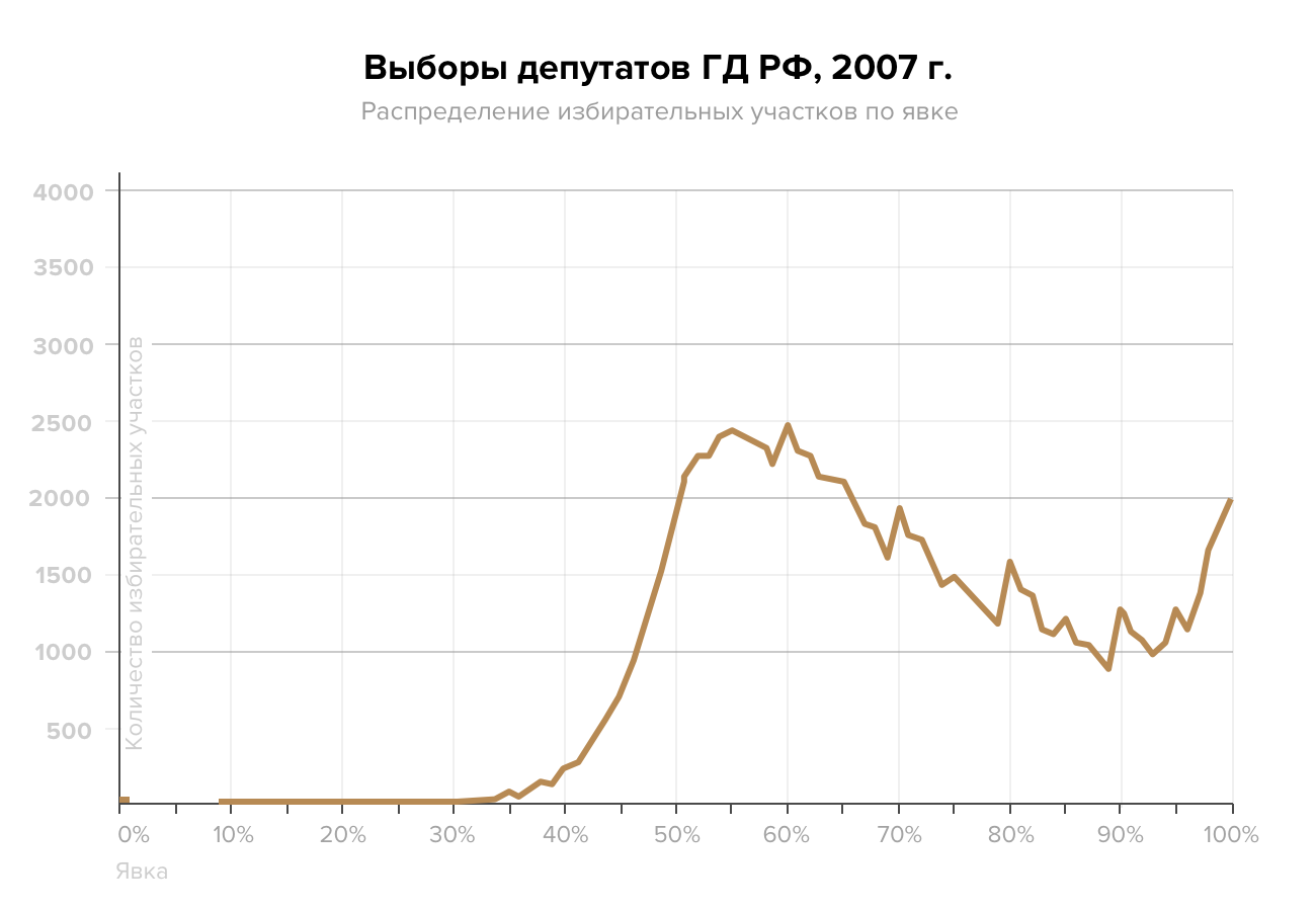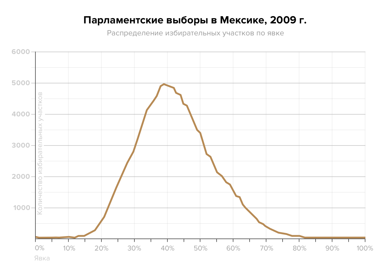 Многие слышали, что исследователи выборных фальсификаций часто смотрят, как показатели голосования и явки распределяются на графике. По нормальному закону распределения график данных с честных выборов может принимать форму колокола — с одним «горбом».