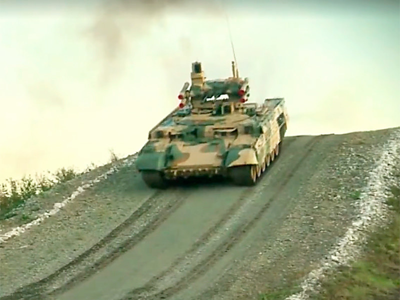 Речь идет о боевой машине поддержки танков (БМПТ) "Терминатор". На видео показано, как "Терминатор" преодолевает различные препятствия и водные преграды, а также стреляет по мишеням.