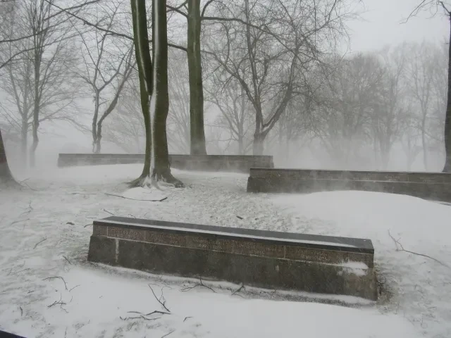 In good weather there is probably a beautiful view of the huge lake from above. But now I was being blown away. Hiding behind the tree trunk I waited for another snowfall to wane, looking at the long tombstones with the names of soldiers.