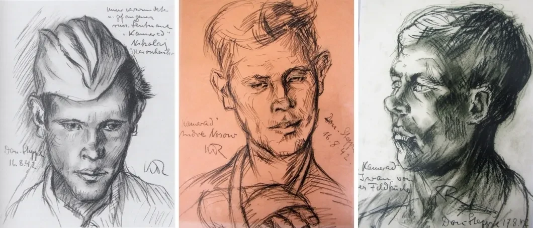 «Here are the Russian prisoners of war,» Wolf-Dietrich shows portraits of young guys — one has a side cap on his head, the other is with a bandaged hand. «He signs the drawing: «Kamerad Iwan», «Kamerad Nikolaj». But «kamerad» means even more than a friend.»