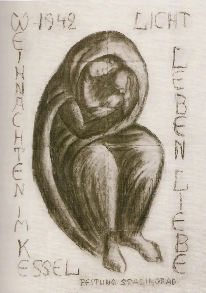 This is «The Stalingrad Madonna». Under a soft light, it hangs on a black wall in the shadows of the Kaiser Wilhelm Memorial Church in the heart of West Berlin. It was drawn by the German military physician Kurt Reuber.