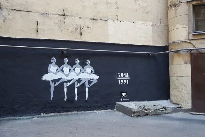 Уличные художники изобразили на рисунке сцену из «Лебединого озера». Таким образом они напомнили, как во время путча 1991 года по телевизору показывали балет.