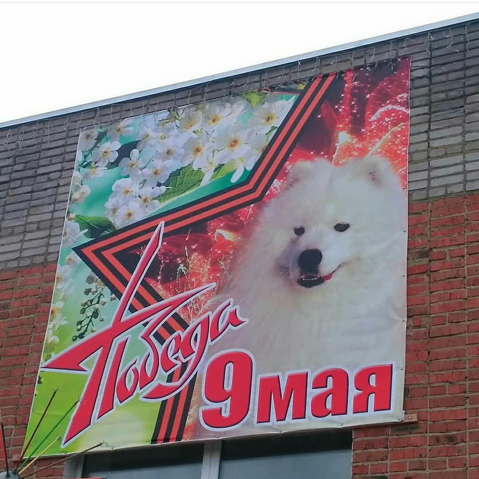 Глава кузбасского поселка рассказал о звонке из прокуратуры по поводу плаката с собакой к 9 мая, который повесил местный бизнесмен