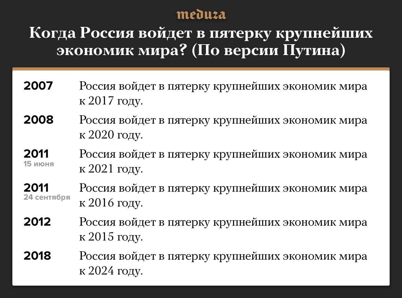 Путин давно хочет вывести Россию в пятерку ведущих экономик мира. Но все время сдвигает сроки
