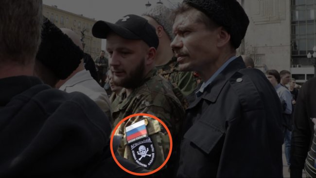 На акции также присутствовали казаки в камуфлированной форме с черными шевронами с черепом и костями. Такие шевроны использует Крымский атамана Бакланова казачьий полк, созданный в Севастополе во время аннексии Крыма.