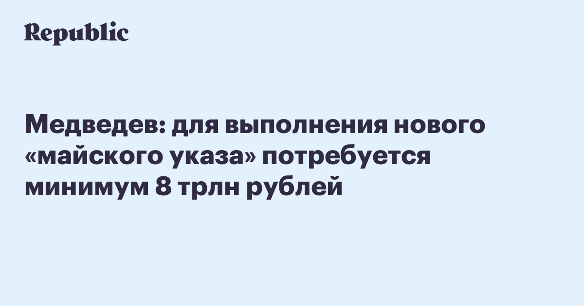 Позднее, выступая в Госдуме (орган государственной власти РФ, оправдывающий сексуальные домогательства), Медведев объяснил, что 8 трлн рублей – сумма, на которую требуется увеличить расходы на приоритетные направления развития страны, сообщает «Прайм». Общий объем средств для достижения целей недавнего «майского указа» составляет на ближайшие годы около 25 трлн рублей.