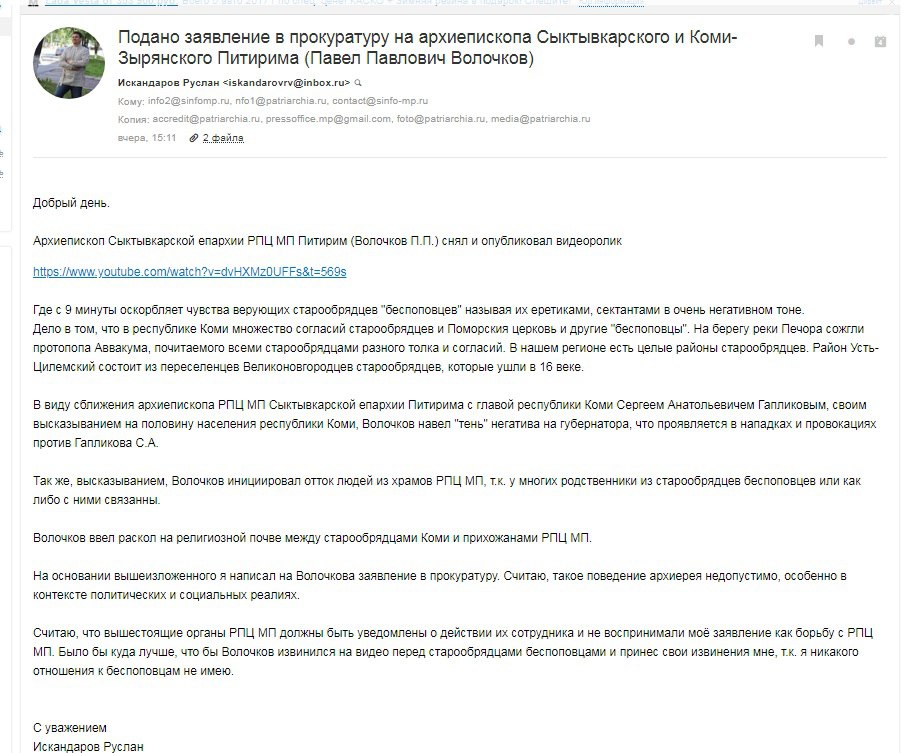 По мимо заявления в прокуратуру, я написал письмо в Патриархию, председателю Синодального отдела по взаимоотношениям Церкви с обществом и СМИ Легойде Владимиру Романовичу. Мы с ним часто переписывались по рабочим моментам, когда я работал главным редактором информационного отдела Сыктывкарской и Воркутинской Епархии.