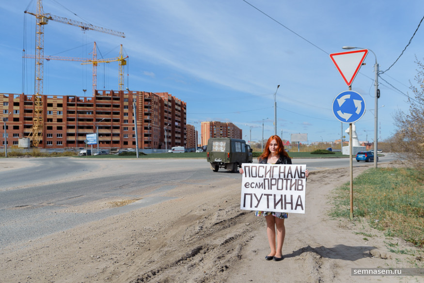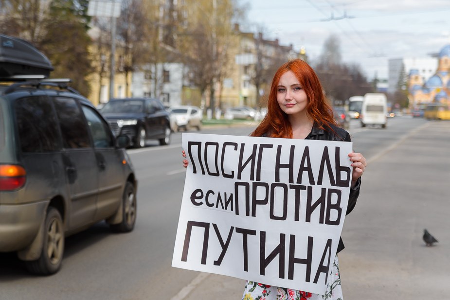 The picket started at 9 am near the sculpture "Bread-and-salt". Arina Epifanova held the poster "Beep if against Putin". Drivers beeped rarely.