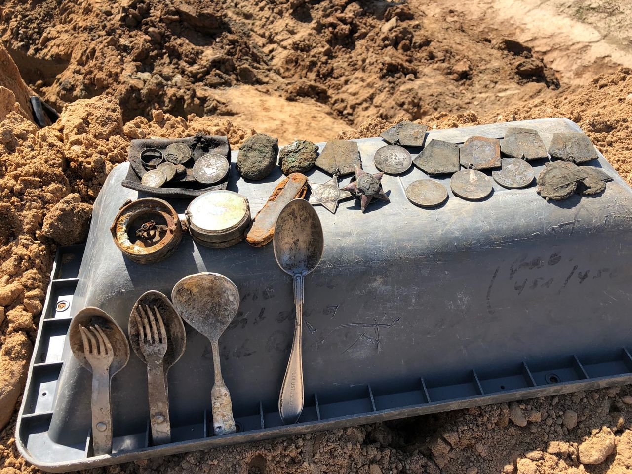 Три десятка людей не останавливали свою работу ни на минуту. Откопали лежавшие рядом пять так и не взорвавшихся гранат, несколько ложек, курительную трубку, сделанный из гильзы снаряда фитиль — даже немного ткани сохранилось, прохудившуюся каску, маленький перочинный нож, две советские трехкопеечные монеты и много маленьких частей человеческих костей. Кости складывали в небольшой ящик. Самая ценная находка — несколько медалей «За отвагу». Медали пронумерованы, а это значит, что награжденные ими будут опознаны. В отличие от большинства солдат.